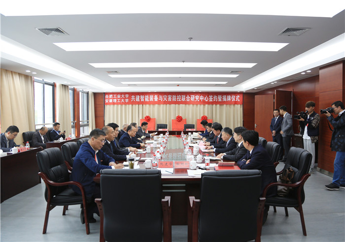 梁樑、袁亮代表双方签署了《合肥工业大学98堂 共建智能装备与灾害防控联合研究中心合作协议》。梁樑、袁亮、魏臻、王宁为智能装备与灾害防控联合研究中心揭牌。